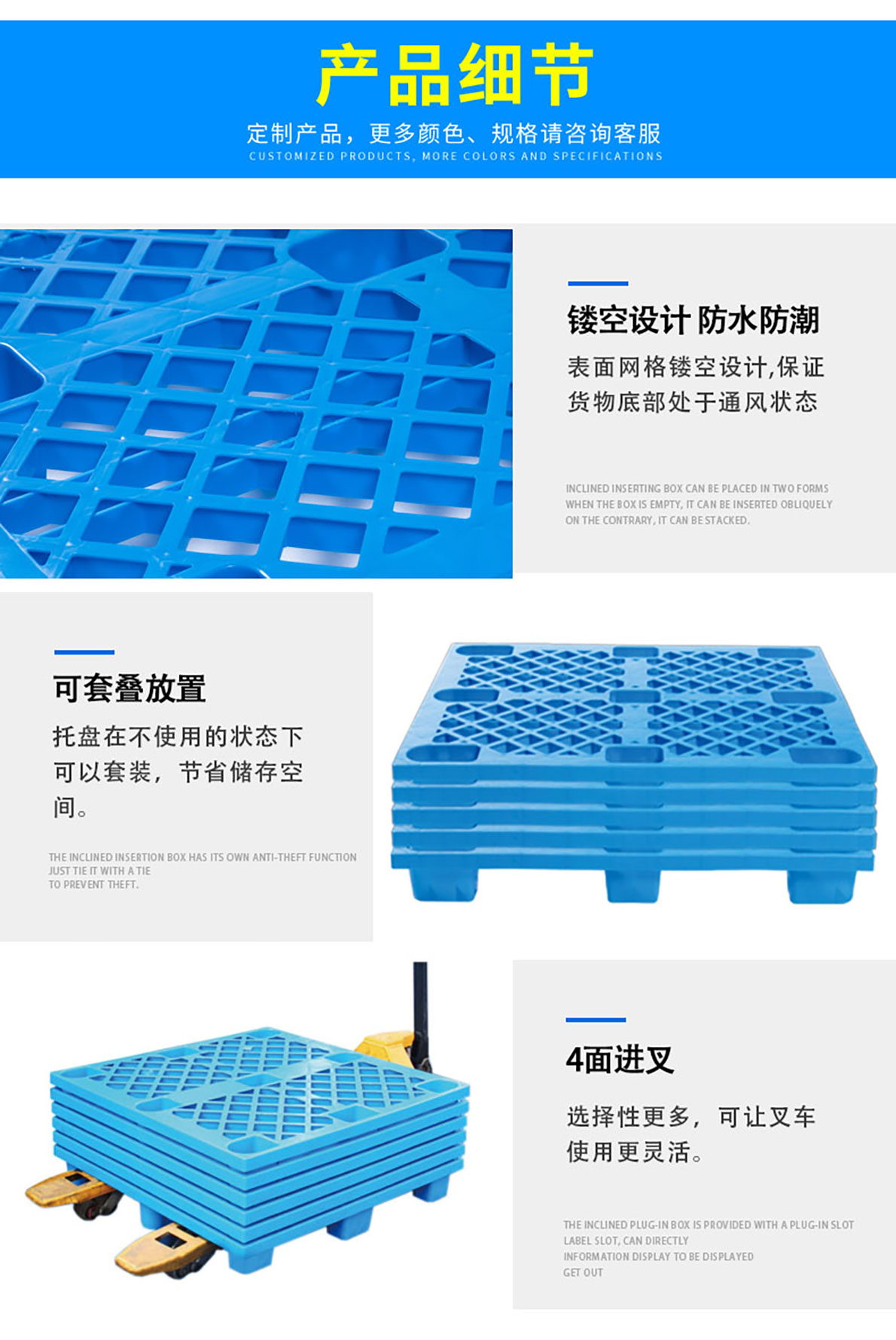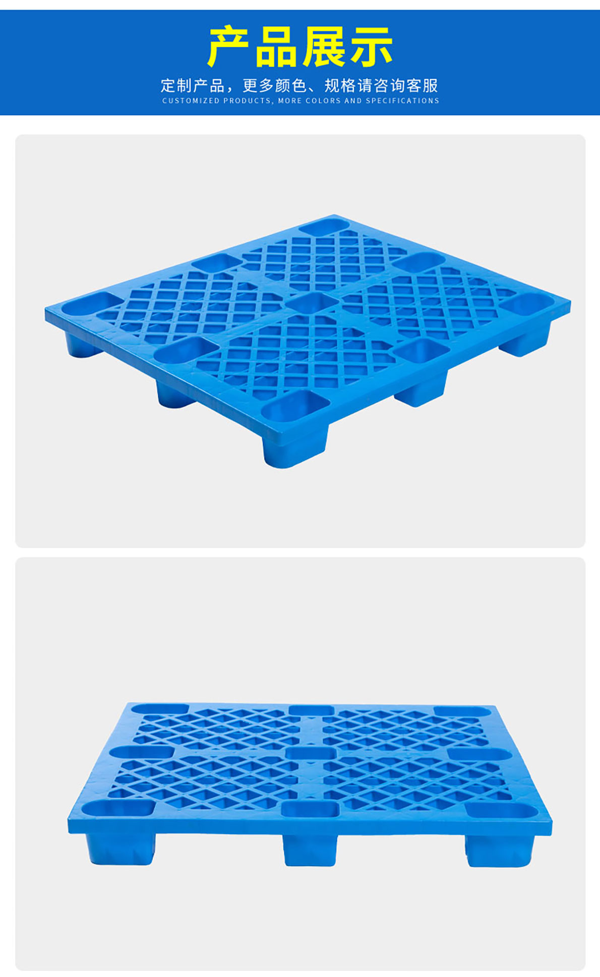 塑料托盤是一種與叉車、貨架等物流設備配套使用的物流單元。塑料托盤的出現適應環保需要,與傳統 木托盤相比,減少了對森林的破壞。是現代物流業發展的產物。塑料托盤因其產品特點:防腐蝕、防潮 濕、防銹蝕、抗蟲蛀、不發霉等,廣泛應用于各行業領域。