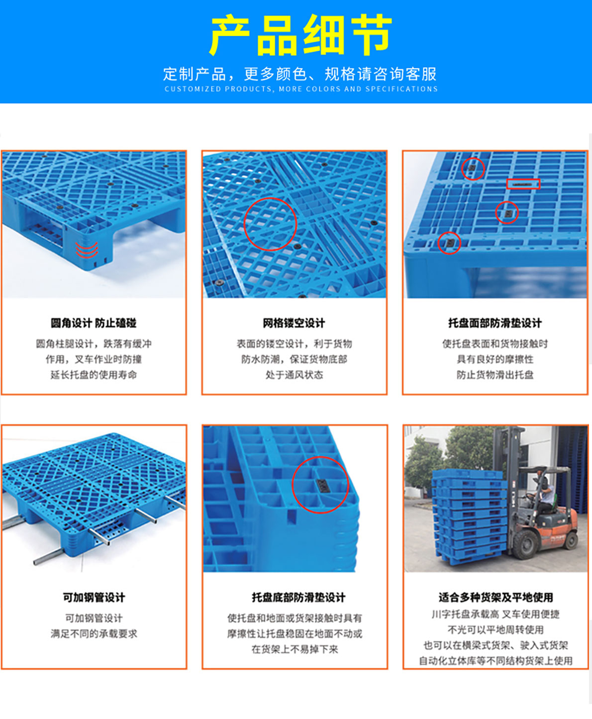 塑料托盤是一種與叉車、貨架等物流設備配套使用的物流單元。塑料托盤的出現適應環保需要,與傳統 木托盤相比,減少了對森林的破壞。是現代物流業發展的產物。塑料托盤因其產品特點:防腐蝕、防潮 濕、防銹蝕、抗蟲蛀、不發霉等,廣泛應用于各行業領域。